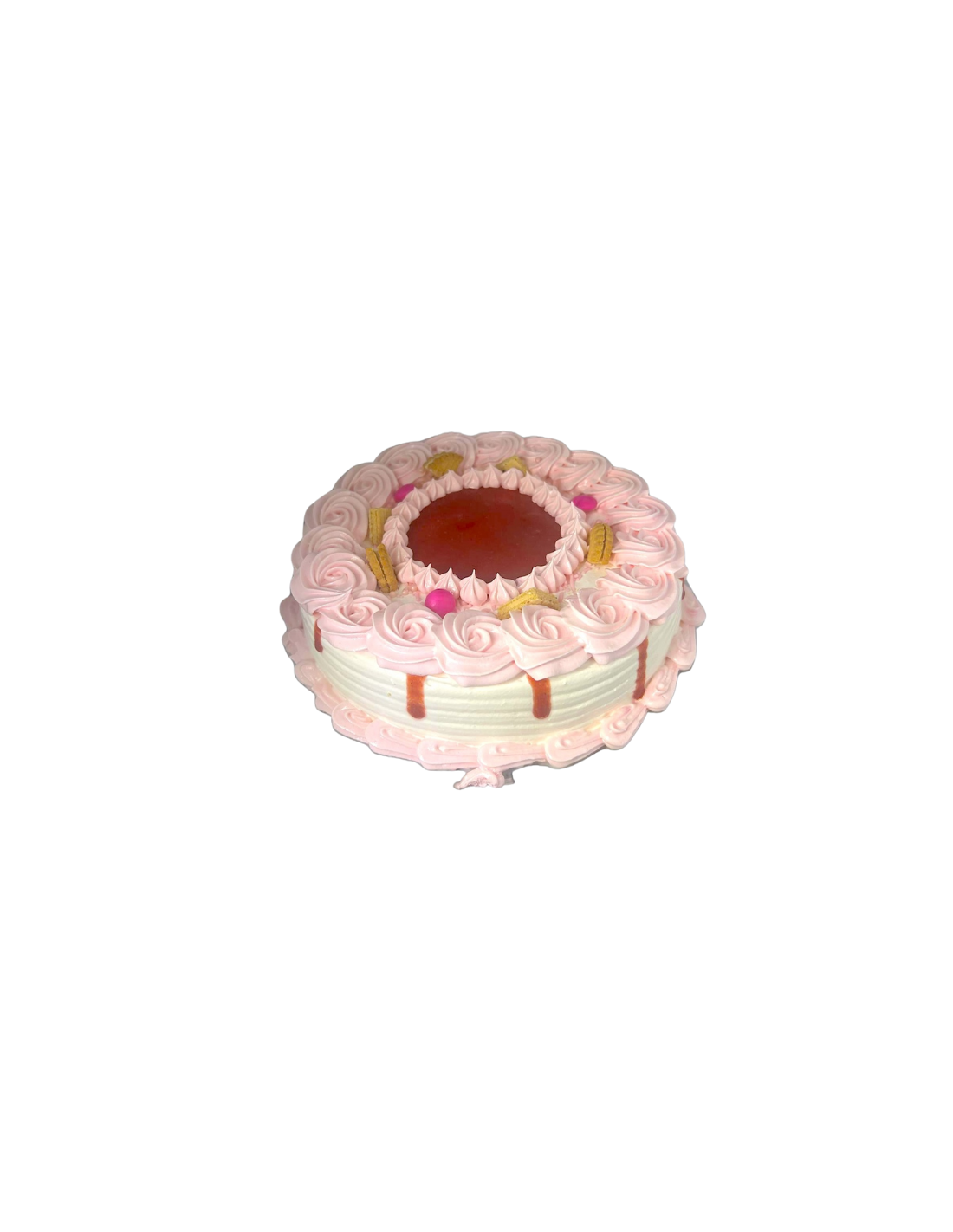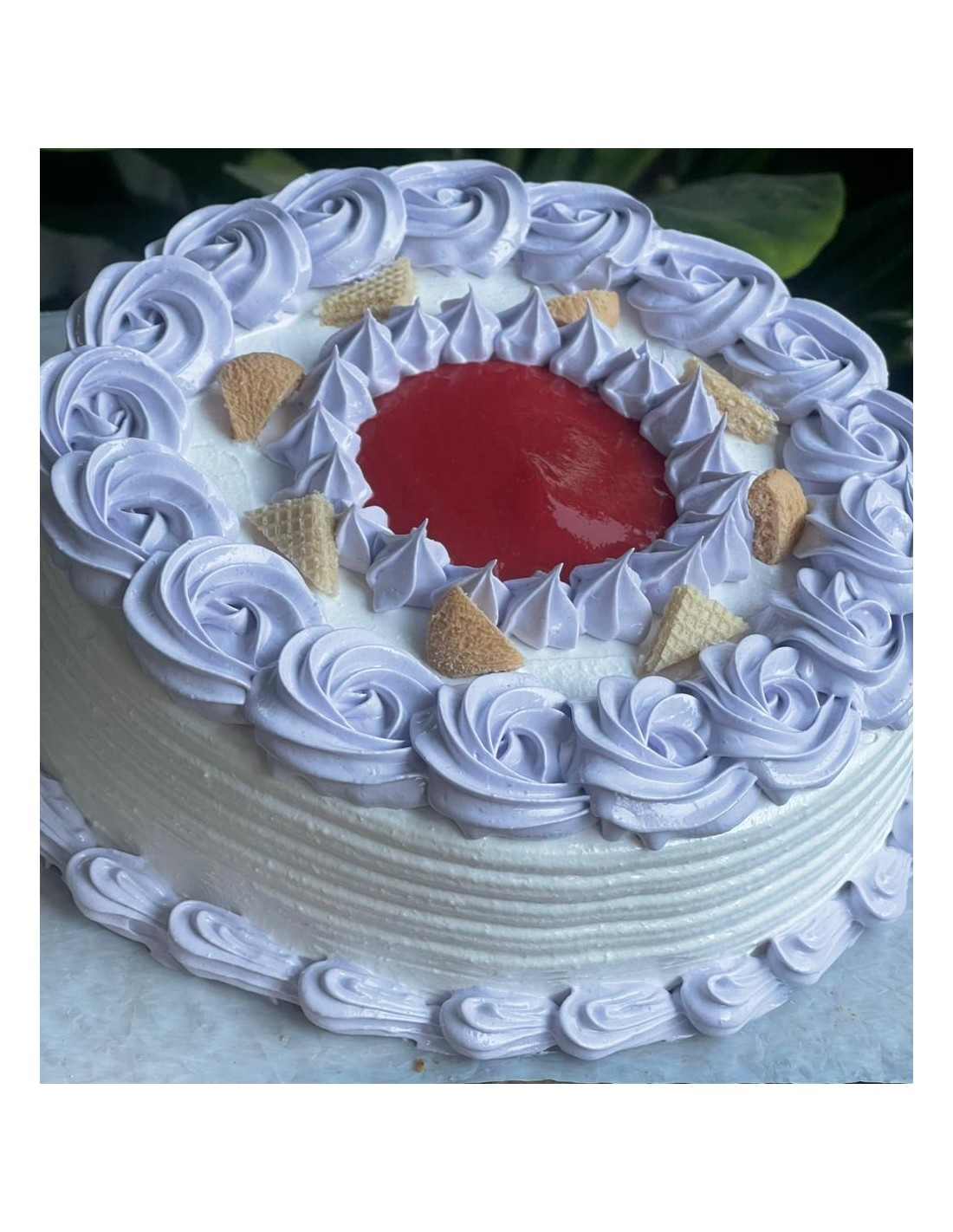 Nuestra exquisita panetela se caracteriza por suaves capas de bizcocho alternadas con generosas cantidades de relleno de guayaba, creando un equilibrio perfecto entre textura y sabor tropical. La superficie está magistralmente decorada con crema batida de tonos suaves y coronada con un brillante y tentador centro de gelatina de guayaba que no solo atrae la vista sino que deleita el paladar