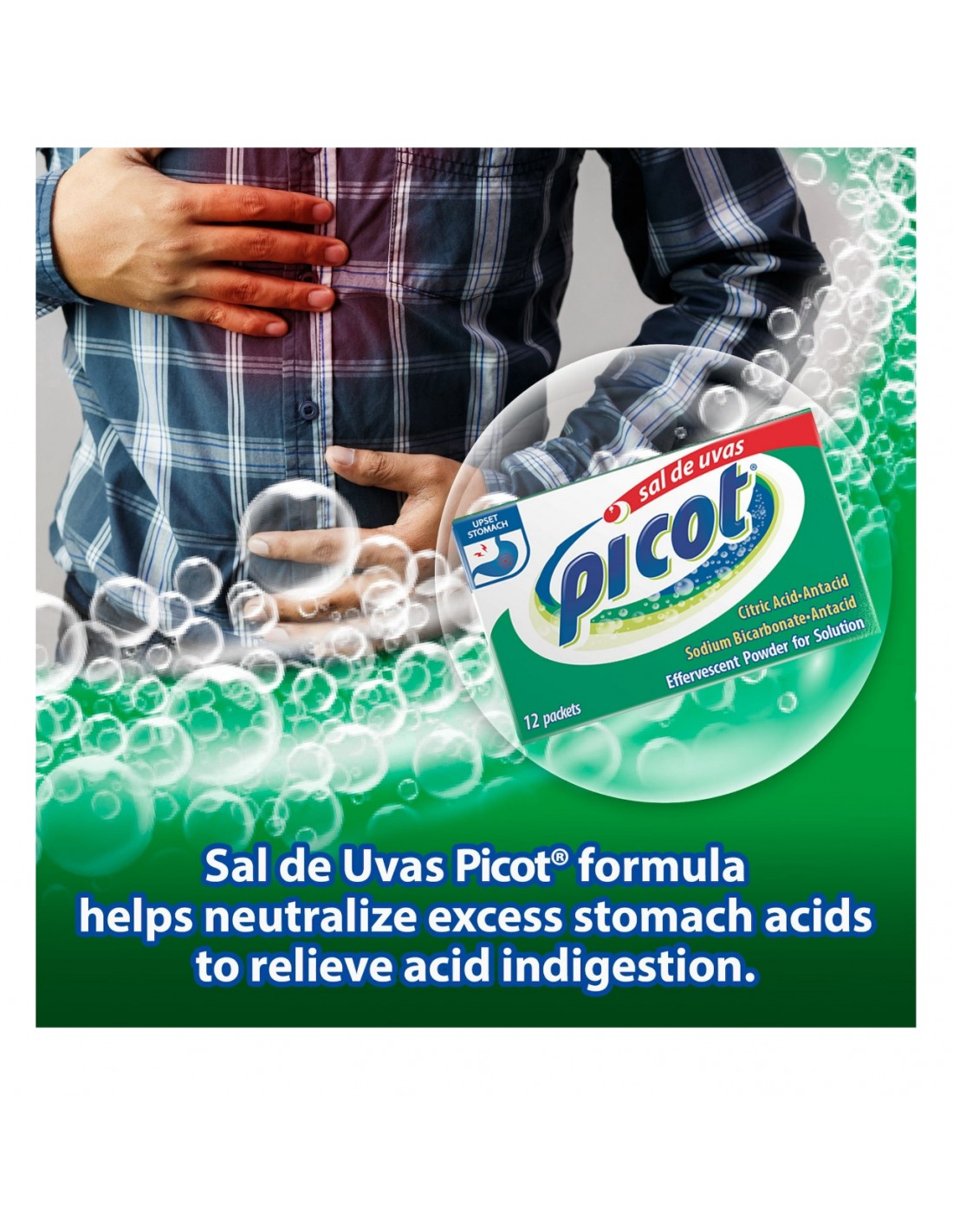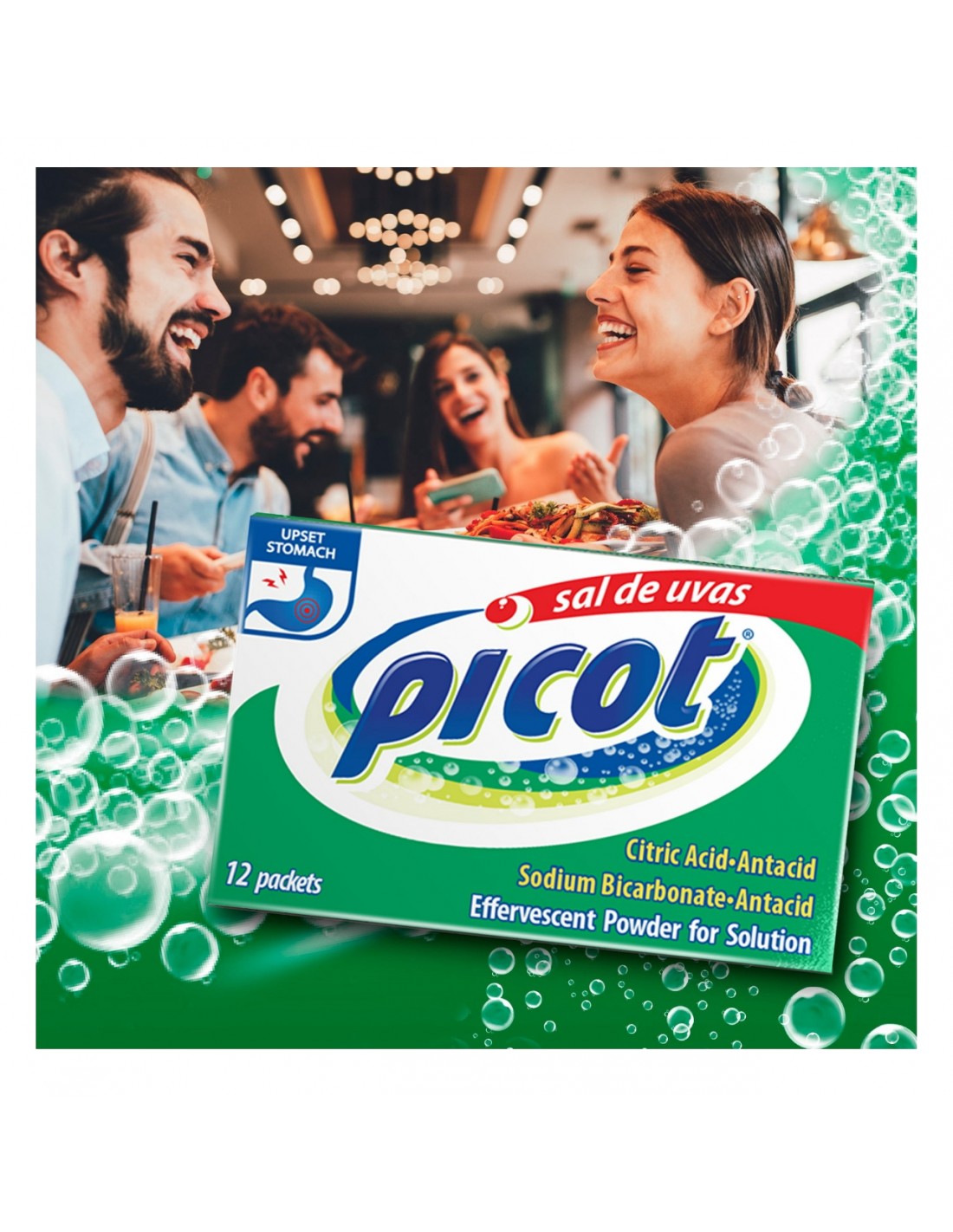Picot Sal de Uvas es un remedio efervescente de acción rápida para el malestar estomacal. Este antácido combina el poder del ácido cítrico y el bicarbonato de sodio para aliviar la acidez, la indigestión y la sensación de inflamación. Cada caja contiene 12 sobres individuales, perfectos para llevar contigo y usar en cualquier momento que necesites un alivio eficaz y rápido.