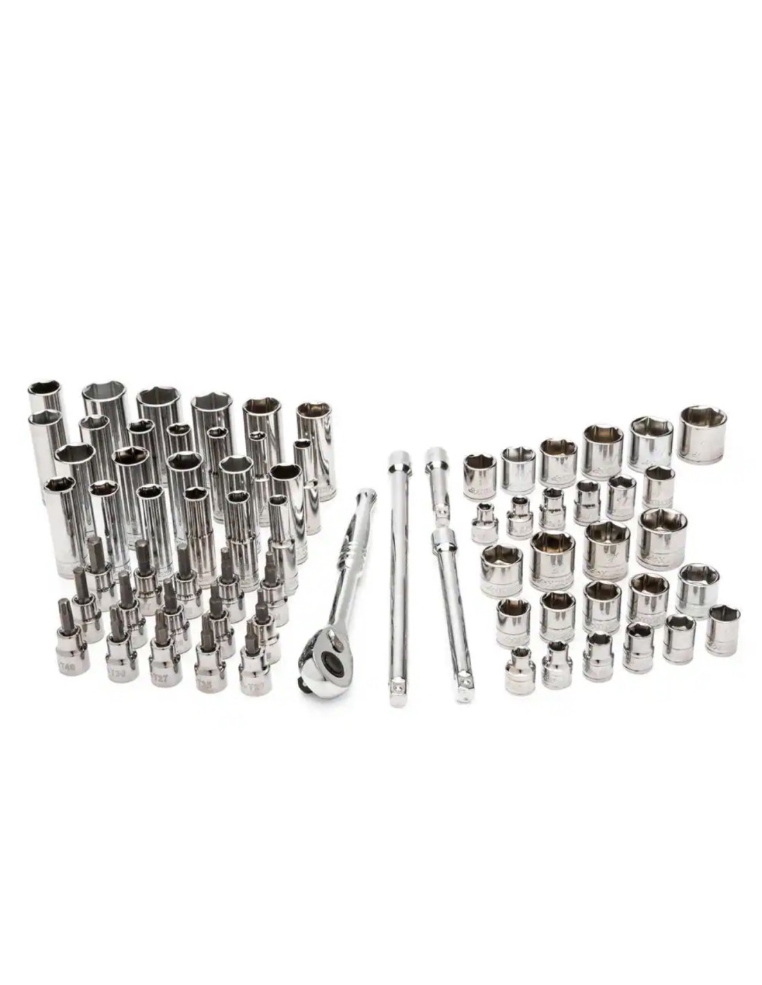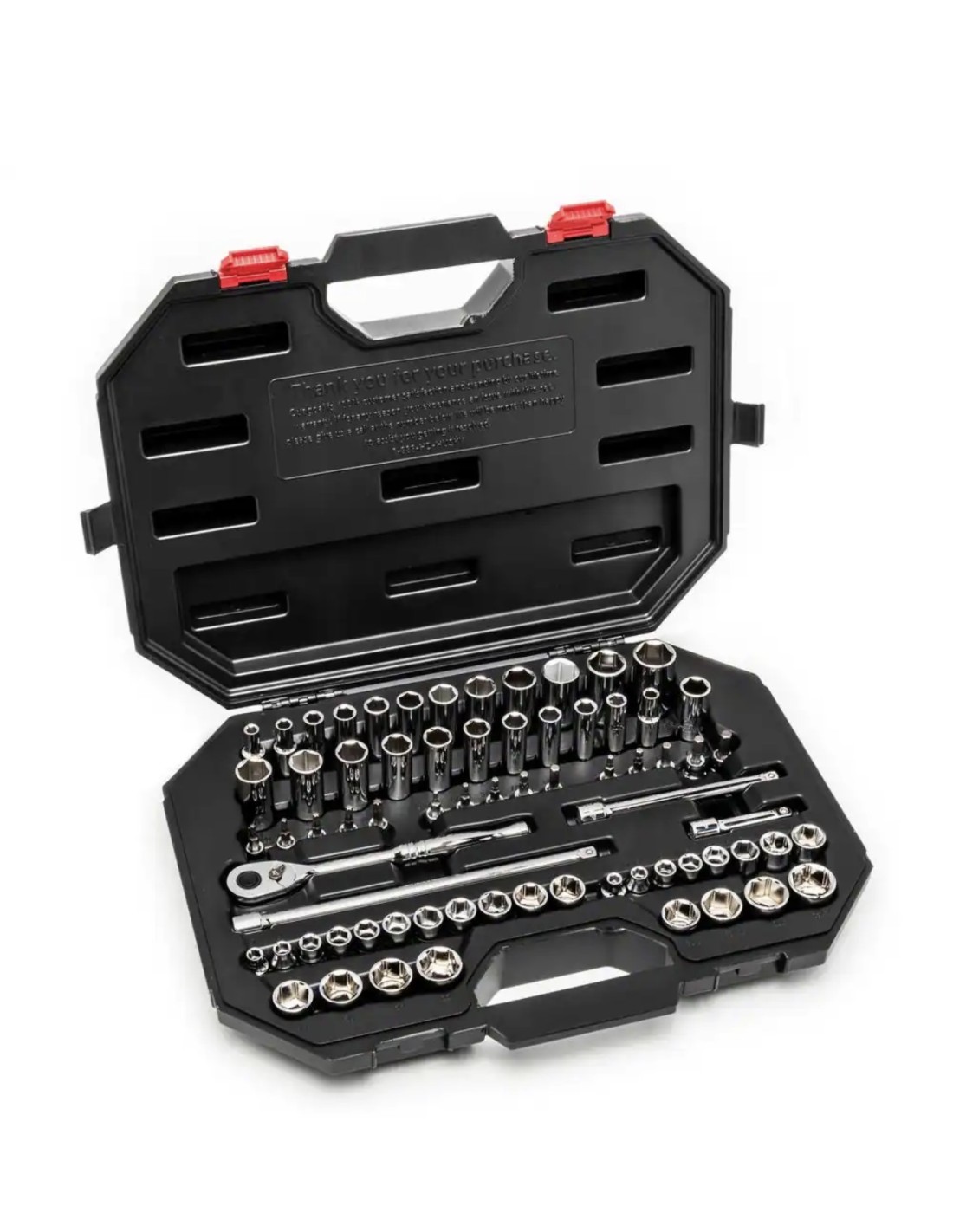 66 vasos SAE y métricos, 3 extensiones (3″, 6″, 10″) y una maleta plástica resistente.