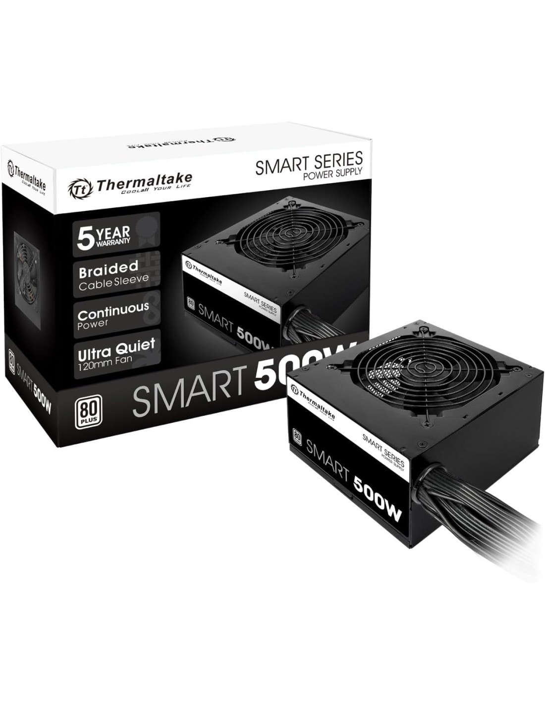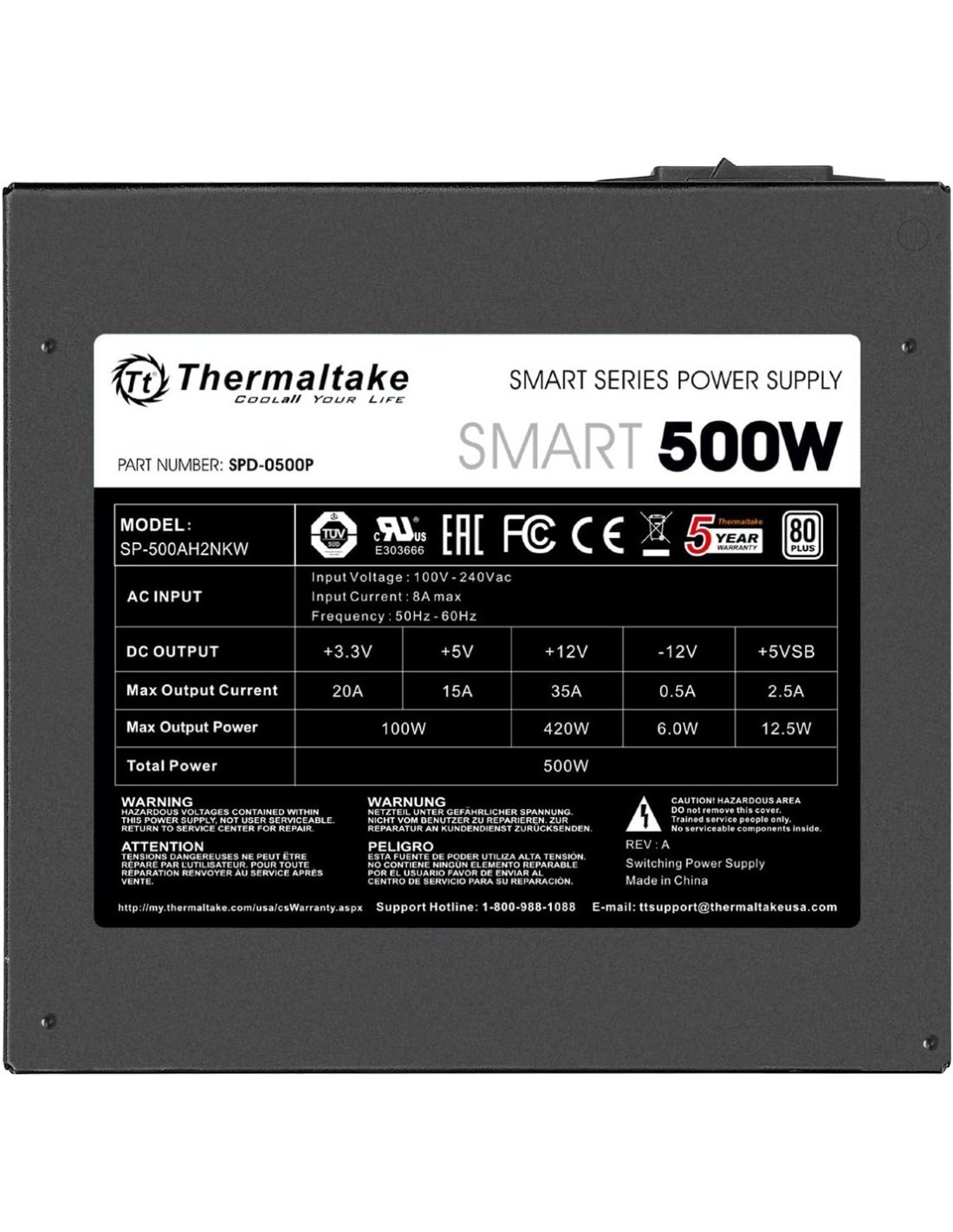 La fuente de alimentación Thermaltake Smart 500W 80+ White Certified ofrece un rendimiento fiable para sistemas de gama media, con certificación de eficiencia, conectores modernos y ventilador silencioso de 120 mm. Diseñada para cumplir con el estándar ATX 12V v2.3 y EPS 12V, esta unidad incorpora corrección activa del factor de potencia (Active PFC), y un diseño de raíl único +12 V que asegura estabilidad bajo carga.
