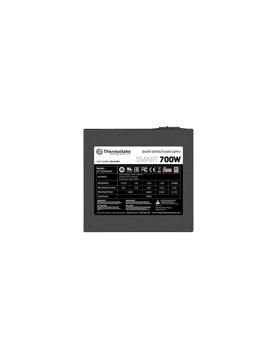 La fuente de alimentación Thermaltake Smart 700 W 80+ White (modelo PS-SPD-0700NPCWUS-W) está diseñada para brindar una alimentación estable y eficiente para sistemas de gama media, con los estándares ATX 12V v2.3 y EPS 12V. Su certificado de eficiencia 80 PLUS Standard (hasta ~86 %) y ventilador de 120 mm ultra silencioso permiten un funcionamiento confiable y discreto.