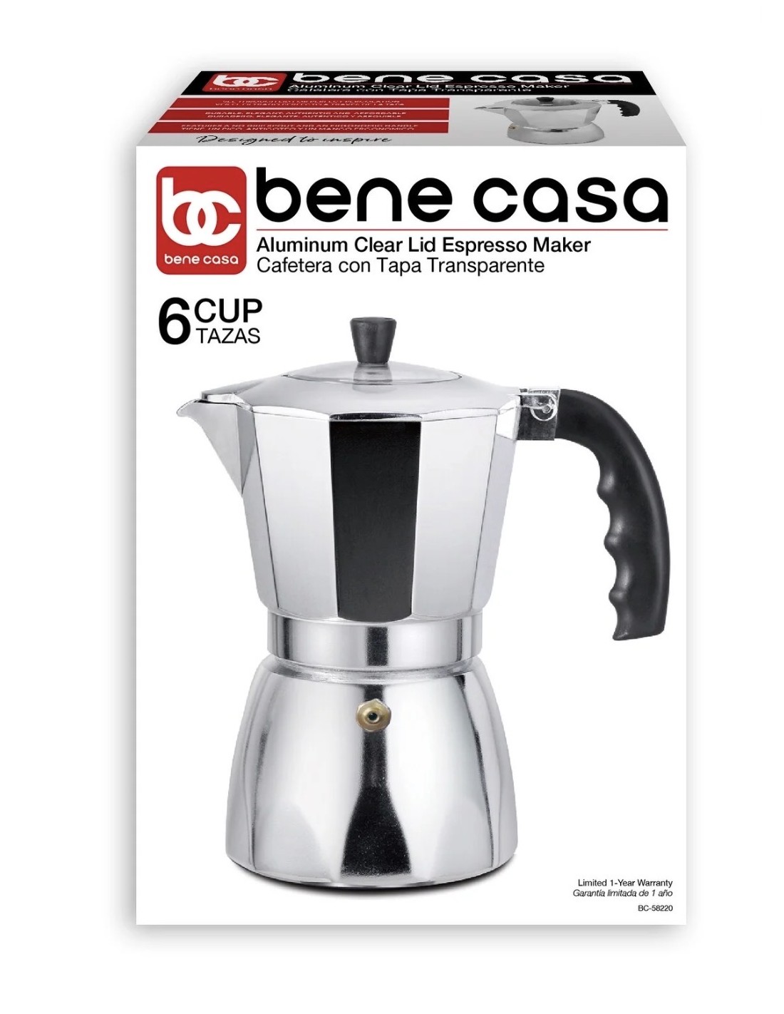 La cafetera Bene Casa de aluminio para estufa, con capacidad de 6 tazas, combina diseño clásico con funcionalidad. Su exterior pulido le da un toque elegante a la cocina, mientras que la tapa transparente te permite ver el proceso de extracción sin abrir la cafetera. Esta cafetera es fácil de usar y perfecta para preparar espresso auténtico en la estufa de tu hogar.